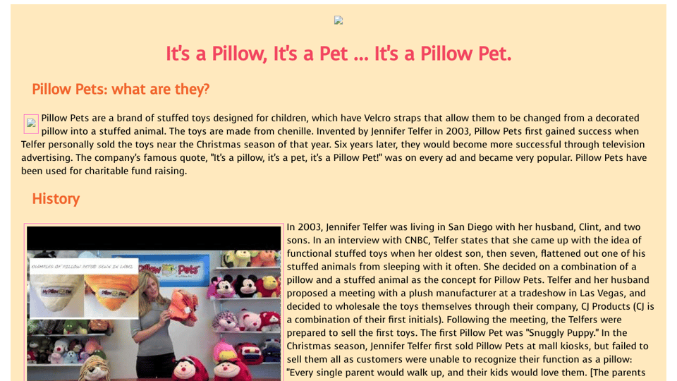 Thus in my view the file fails criterion 8 in any sense. Notice the Fisher-Price tag. The Person who created Pillow Pets is a Mom named Jennifer Telfer.